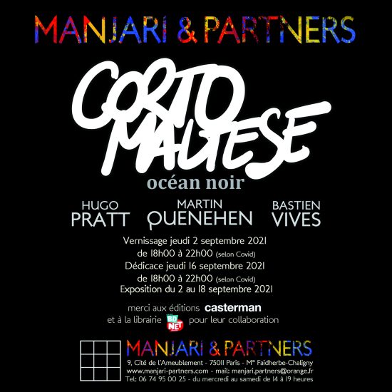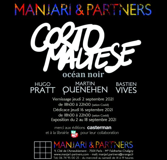 Du 2 au 18 septembre 2021, exposition pour la sortie de l’album « Océan noir » Corto Maltese. Bastien Vives et Martin Quenehen réinterprètent le mythe créé par Hugo Pratt chez Casterman.